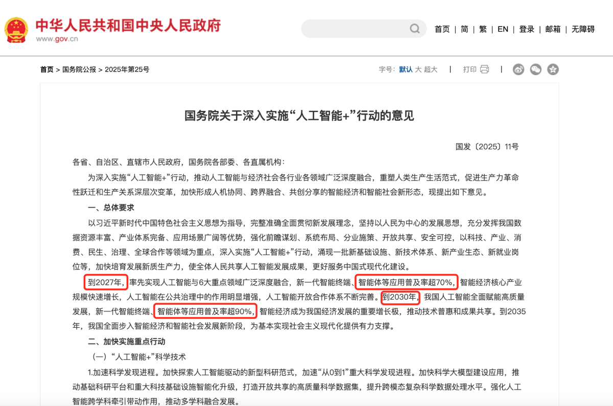 国务院《“人工智能+”行动指导意见》明确提出,要推动智能体技术在民生服务、文化旅游等领域的深度融合与应用创新,到2027年,智能体应用普及率超70%。到2030年,智能体应用普及率超90%。作为“人工智能+”落地的重要形态,智能体正成为赋能千行百业、重塑服务体验的关键力量。